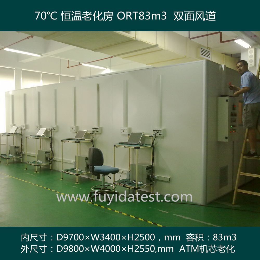老化房4m×9.5m×2.2m, 2間單獨控制和運行 1)工作溫度:室溫~+70℃必須連續可調; 2)老化房庫體采用夾心彩鋼板; 3)內接20個AC220V電源插座、20個R232接口; 4)老化房1點溫度測試,4點溫度監控 |