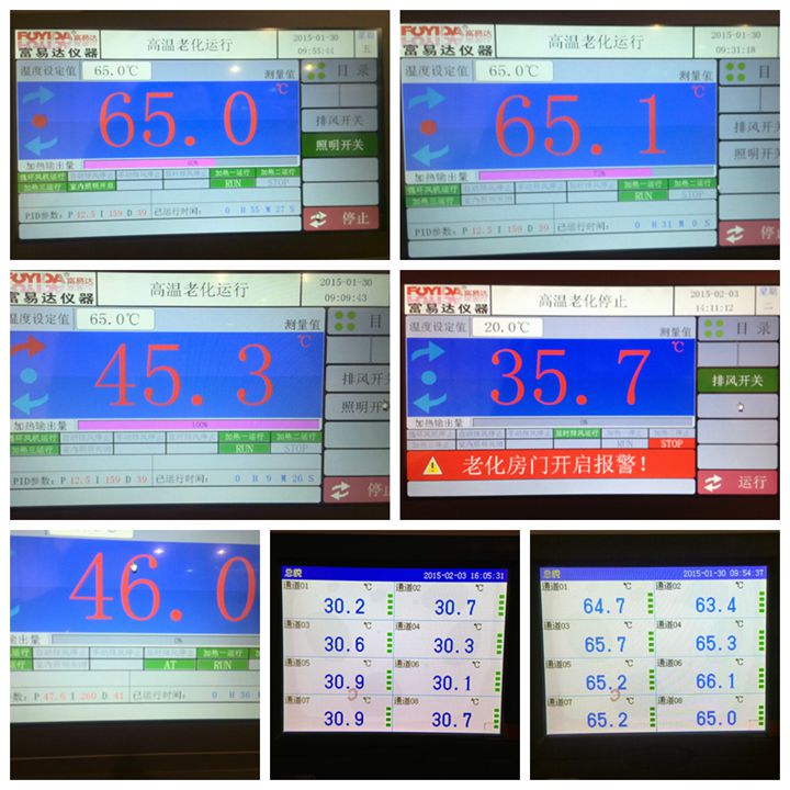 8.23、溫度顯示: a、10.2寸的觸摸屏顯示+2個22寸的LED顯示屏 b、老化總過程溫度自動控制 8.24、聲光報警系統:在老化房外設置設置蜂鳴器,音樂報警,指示老化房內運行狀態 8.25、產品老化過程及狀態監控 a、產品老化過程:當產品進入老化房產品上電后(每個插座設計獨立計時開關),操作人員按下計時器開關(狀態為開)開始計時,產品開始老化(此臺設備的老化進入計時狀態),老化時間到達,計時停止,外部控制面板相應的指示燈指示老化房老化完成。 b、老化狀態監控,在老化房內部線槽和老化房外部控制面板上,同步設計了產品老化的電源狀態指示燈(老化停止狀態、正在老化狀態) c、各個電源插座單獨計時的時序控制程序集成到控制觸摸屏內,增加獨立的PLC和計時控制切換的低壓電器控制箱。 |