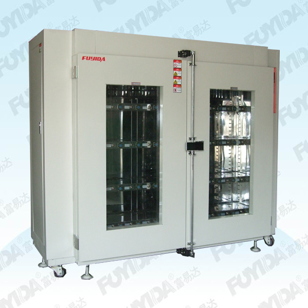 3.1 風道系統:加熱風機及風道系統安裝于老化柜后部,由循環風系統及過熱排風系統組成,室內循環風經加熱器加熱后由送風機經風口送回室內,反復循環,使箱間溫度維持在設定范圍。當箱間溫度超過報警設定值時,排風機啟動,抽走室內過熱氣體,同時室外冷空氣進入箱內與熱空氣混合,使箱間溫度回復正常。