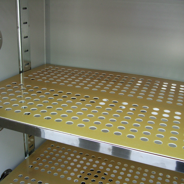3. 老化柜設(shè)計(jì)層架6層,層架高度可調(diào)(最小調(diào)節(jié)跨度為50mm)。層架尺寸為:480×1620mm,采用不銹鋼骨架支撐,表面為2mm厚度的沖孔環(huán)氧樹脂板。